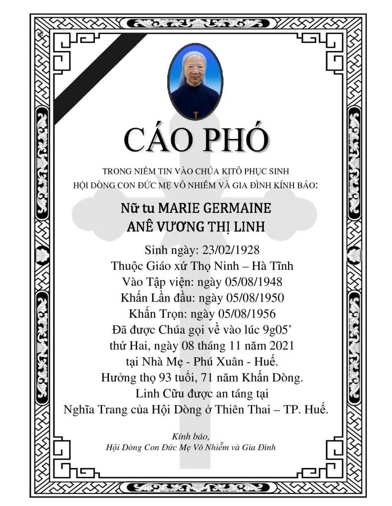 Xin kính báo cùng toàn thể Quý bà con Họ Tộc: Soeur Marie Germaine Anê Vương Thị Linh – Dòng Con Đức Mẹ Vô Nhiễm đã được Chúa gọi về sáng nay lúc 9h05 ngày 08 tháng 11 năm 2021 tại Nhà Mẹ (số 32 Kim Long Huế), hưởng thọ 93 tuổi.
