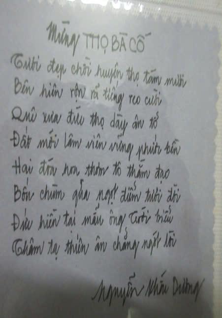 Theo quan niệm xưa, gia đình có 4 trai 2 gái được xem là tốt, gọi là “Tứ quý, nhị kiều”. Nhân dịp mừng thọ Mẹ bát tuần, Thầy Nguyễn Khắc Dương làm một bài thơ tặng Mẹ, cũng nói đến hai con số 4 và 2 này nhưng không theo nghĩa giới tính mà theo ơn gọi: tu trì hay tại thế: