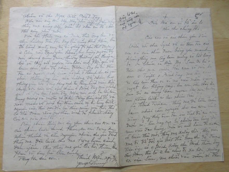 “Bấy nhiêu thầy mẹ âu yếm chúc các con và các cháu luôn mạnh khỏe an vui trong ơn nghĩa thánh và cầu nguyện nhiều cho gia đình thầy mẹ, đặc biệt cho mẹ trong hoàn cản đau yếu. Cho thầy mẹ gửi lời hỏi thăm bác Khai và ông bà bên cạnh