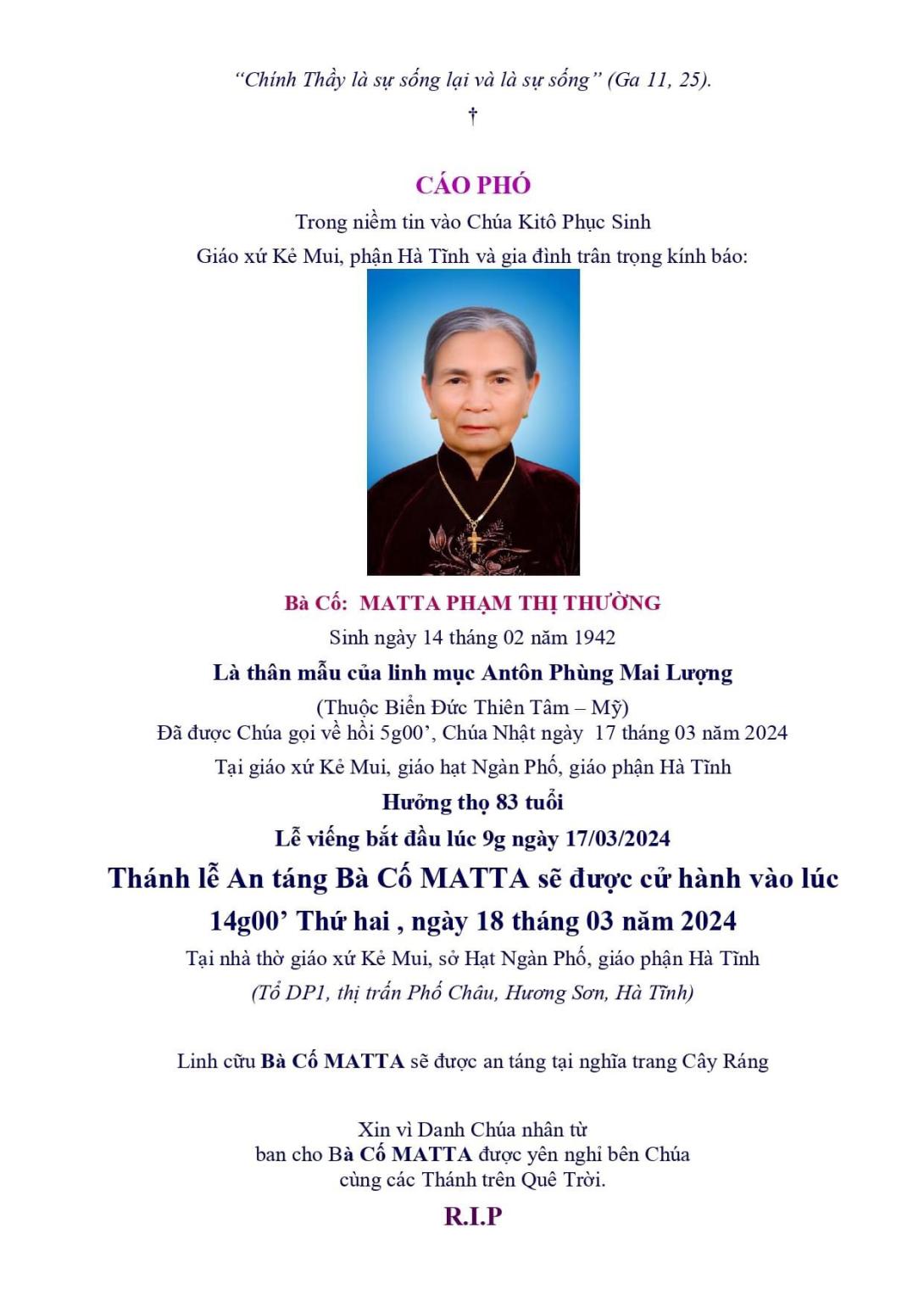 Chủ nhật, 17/03/2024 Tin Buồn Vùng Hà Tĩnh XIN CHIA BUỒN CÙNG GIA ĐÌNH VÀ XIN HIỆP Ý CẦU NGUYỆN CHO LINH HỒN MATTA SỚM ĐƯỢC HƯỞNG NHAN THÁNH CHÚA.Bà cố Matta Phạm Thị Thường là con gái của Bà Vương Thị Hai.