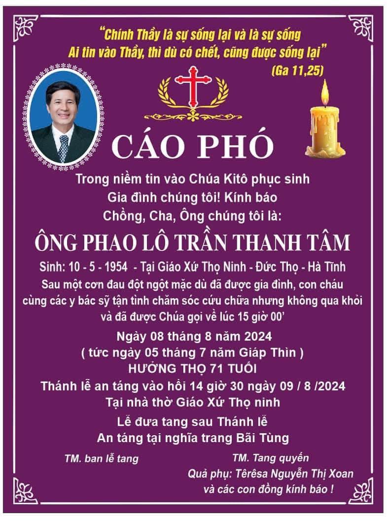 XIN CHIA BUỒN CÙNG GIA ĐÌNH VÀ XIN HIỆP Ý CẦU NGUYỆN CHO LINH HỒN PHAOLÔ SỚM ĐƯỢC HƯỞNG NHAN THÁNH CHÚA.